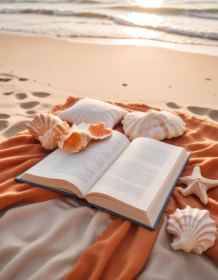 An open book lies on a blanket on a beach, surrounded by seashells and a starfish.