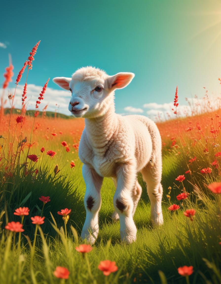 adorable, animal, blue, cute, day, farm, field, flowers, fluffy, grass, green, lamb, meadow, nature, red, sky, spring, sunny, white, wildlife