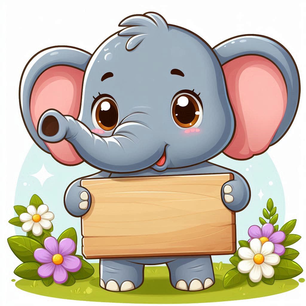 A cartoon elephant with big eyes smiles while holding a blank wooden sign in front of a green field with flowers.
