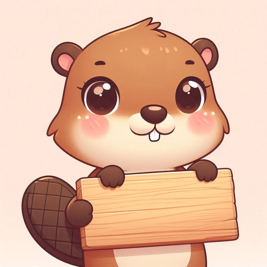 A cartoon beaver with big eyes smiles and holds a blank wooden sign.