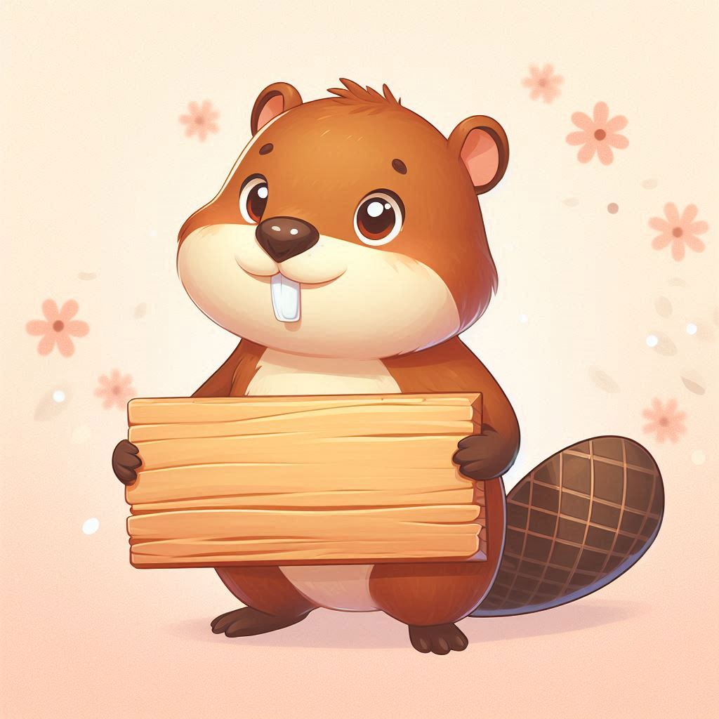 A cartoon beaver with a big smile holds a wooden sign in front of a pink background with flower accents.