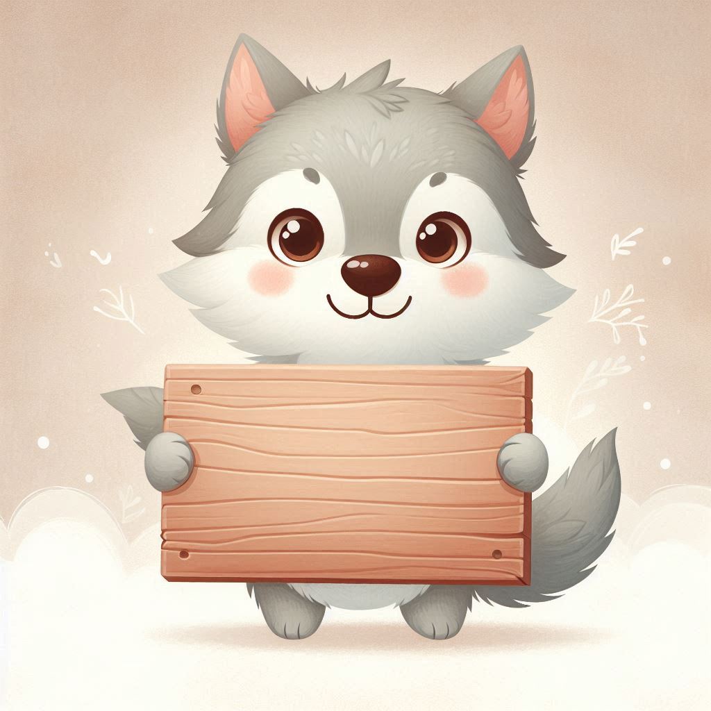 A cartoon wolf with large eyes holds a blank wooden sign in front of it.