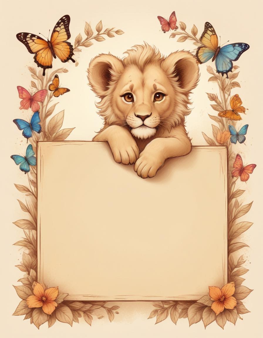 A cute lion cub peeks over a blank sign with a floral border and butterflies.