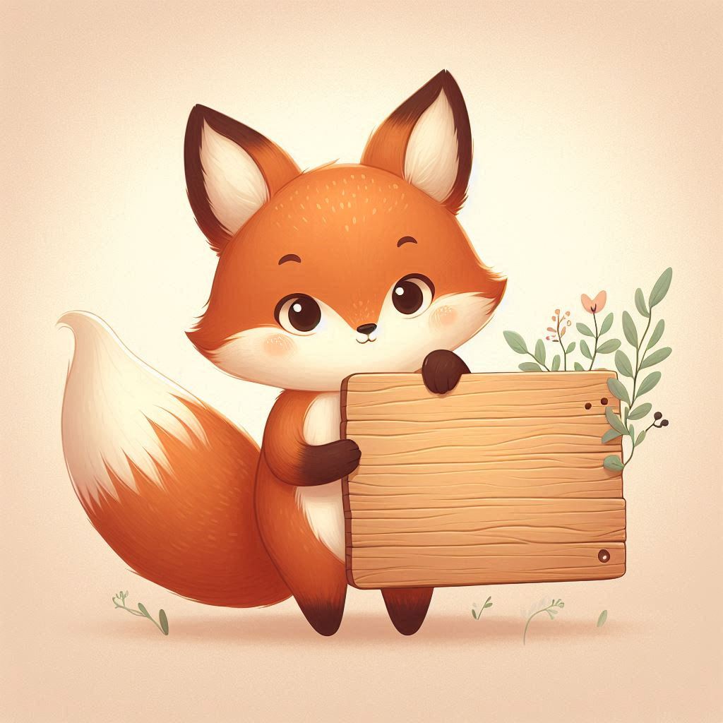 A cartoon fox with large eyes holds a wooden sign with its paws.