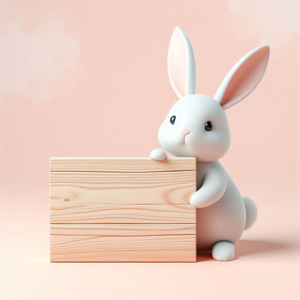 A white bunny holds a blank wooden sign in front of a light pink background.