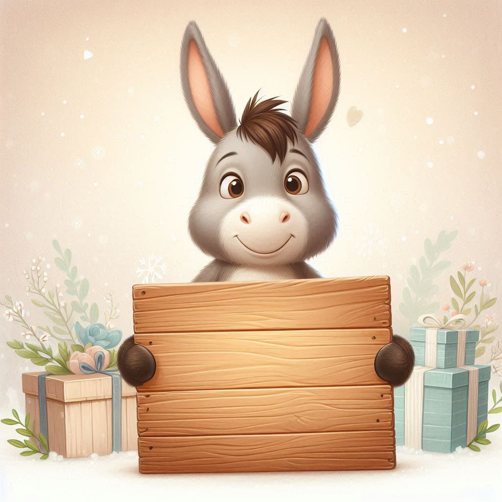 A cute donkey with big ears and a happy smile holds a blank wooden sign with gifts in the background.