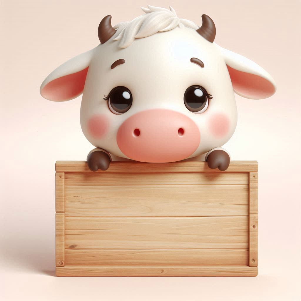 animal, art, brown, cartoon, cow, cute, digital, eyes, farm, hold, illustration, livestock, looking, nose, peeking, pink, sign, white, wood, wooden