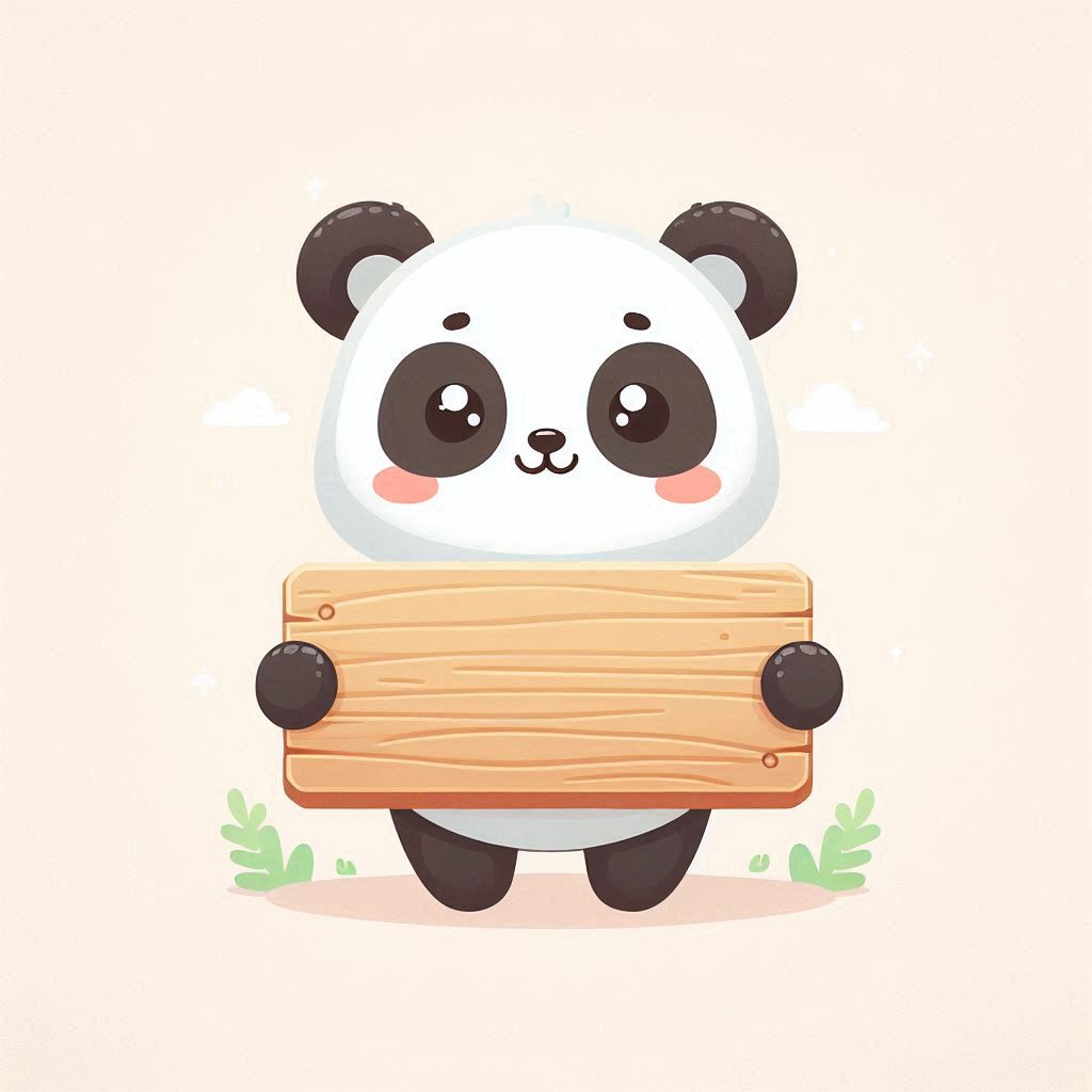 A cartoon panda with big eyes and a happy expression holds a wooden sign in front of it.