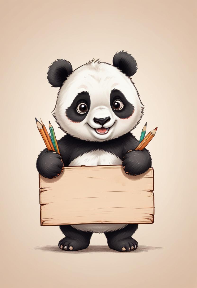 A cartoon panda with black eyes holds a blank sign while holding a bunch of pencils.