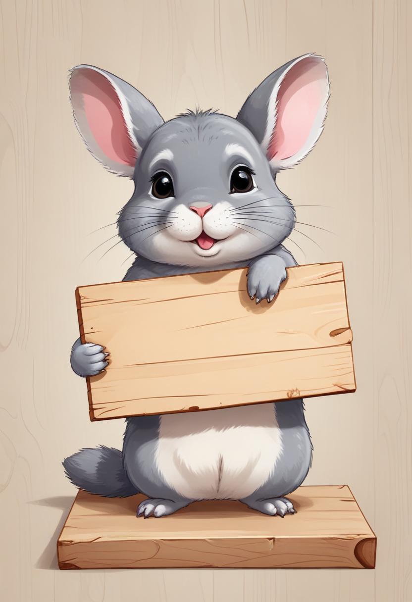 adorable, animal, background, blank, brown, cartoon, chinchilla, cute, furry, grey, happy, hold, illustration, pet, platform, rodent, sign, smiling, white, wooden