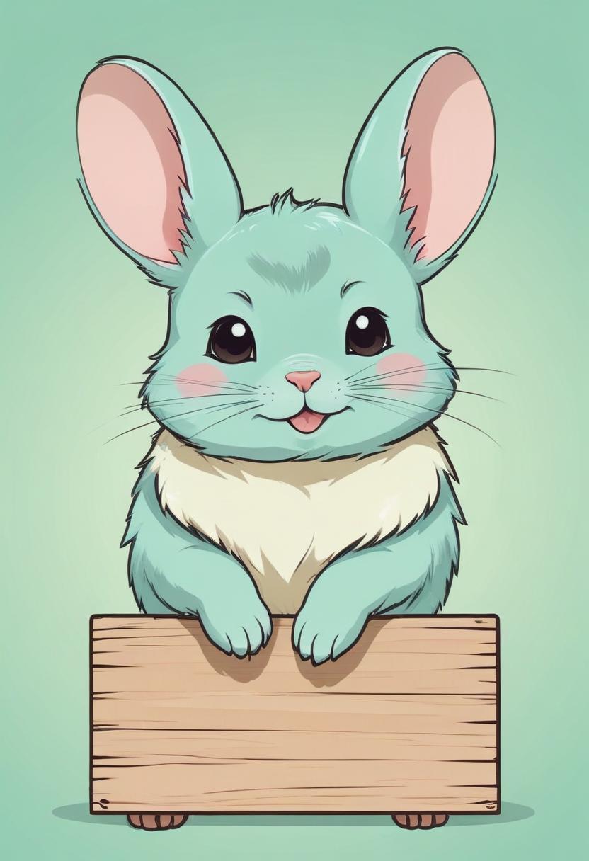A cartoon blue bunny with big eyes and pink ears smiles as it holds up a plain wooden sign.
