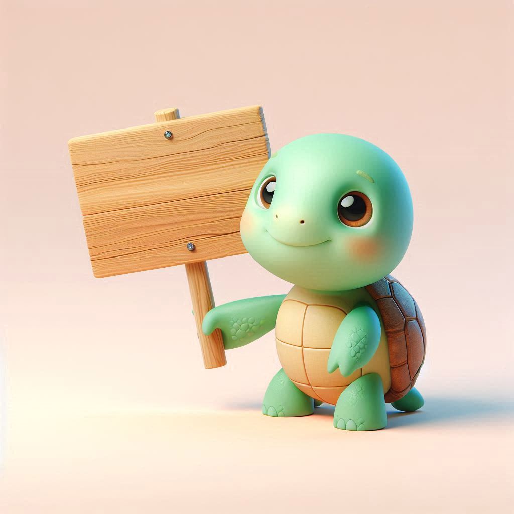 A small, green turtle with big eyes smiles and holds a wooden sign.