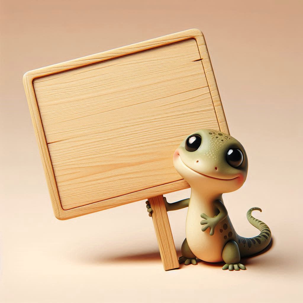 A cute cartoon gecko smiles and holds a blank wooden sign.