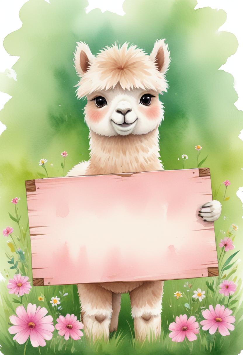 adorable, alpaca, animal, blank, cartoon, cute, field, flowers, fluffy, grass, green, happy, illustration, meadow, nature, pink, sign, summer, watercolor, white