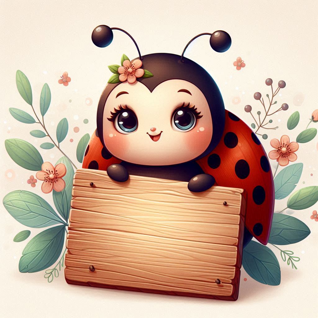 A cartoon ladybug with large eyes and a flower on its head holds a wooden sign in front of it.