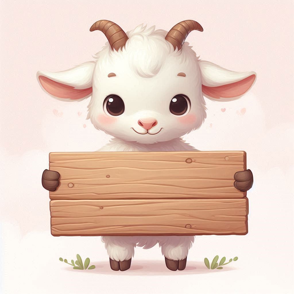 A small, cartoon-style goat with large eyes holds up a plain wooden sign in front of it.