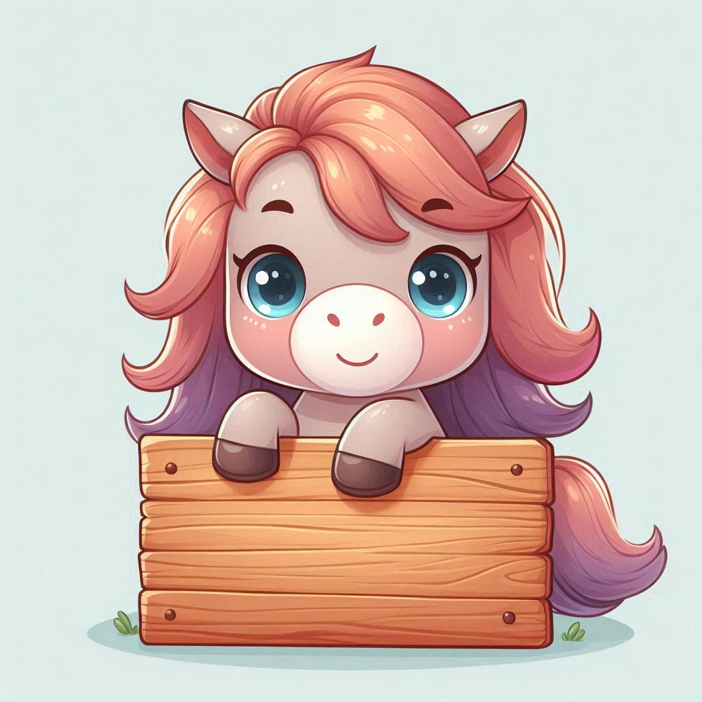 adorable, animal, art, blank, board, cartoon, character, cute, design, digital, graphic, hair, illustration, mascot, pink, pony, purple, sign, smile, wood