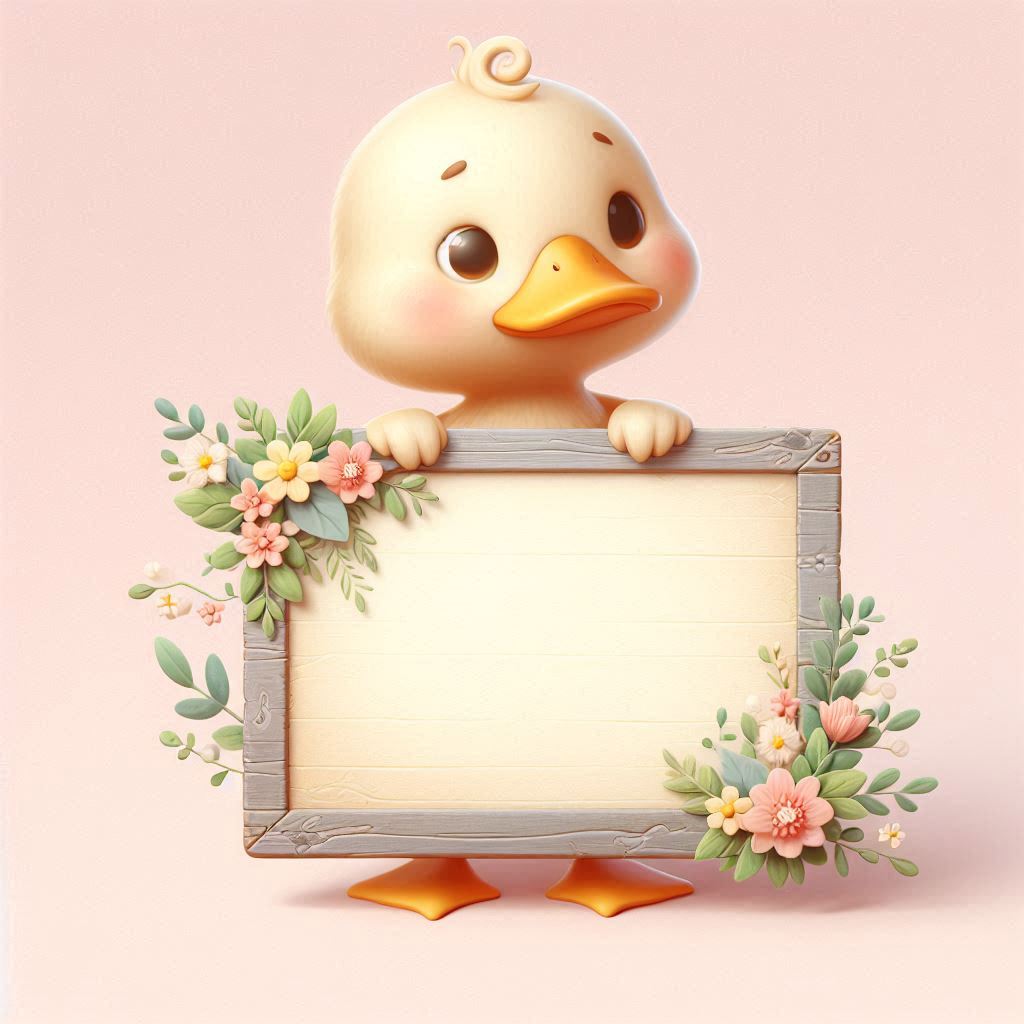 A cartoon duckling holds a blank sign decorated with flowers.
