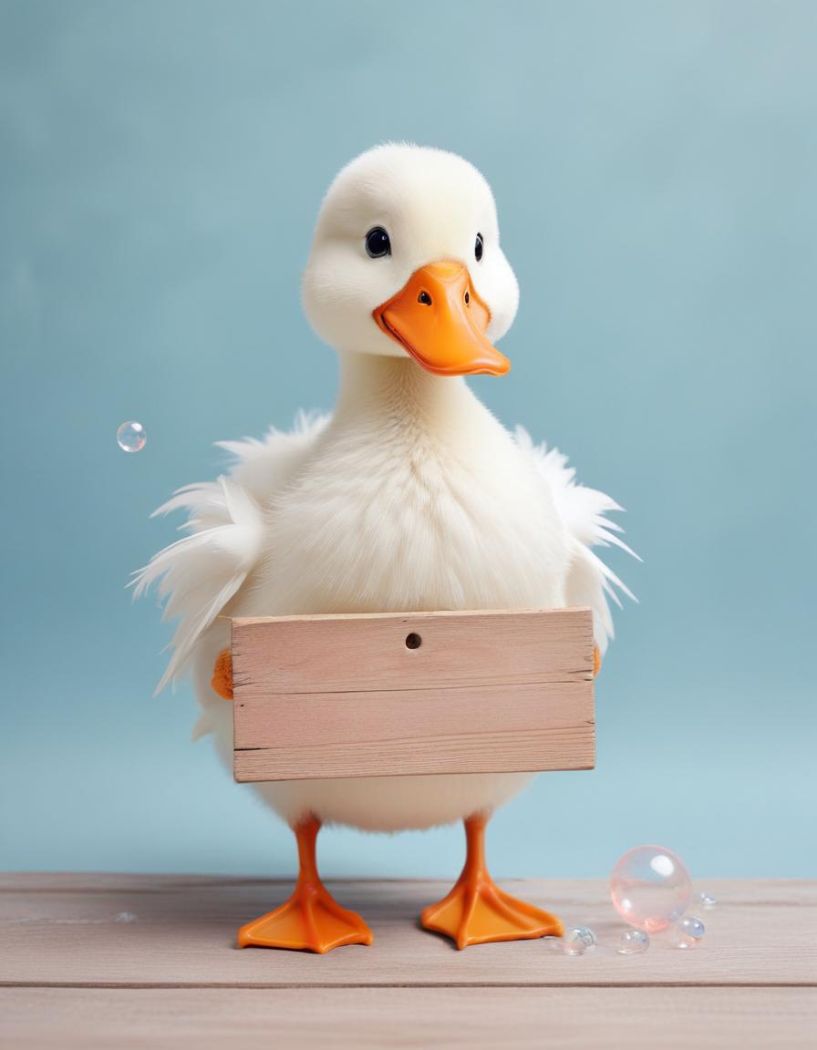 A white duck with orange feet holds a wooden sign in front of a blue background with soap bubbles floating nearby.