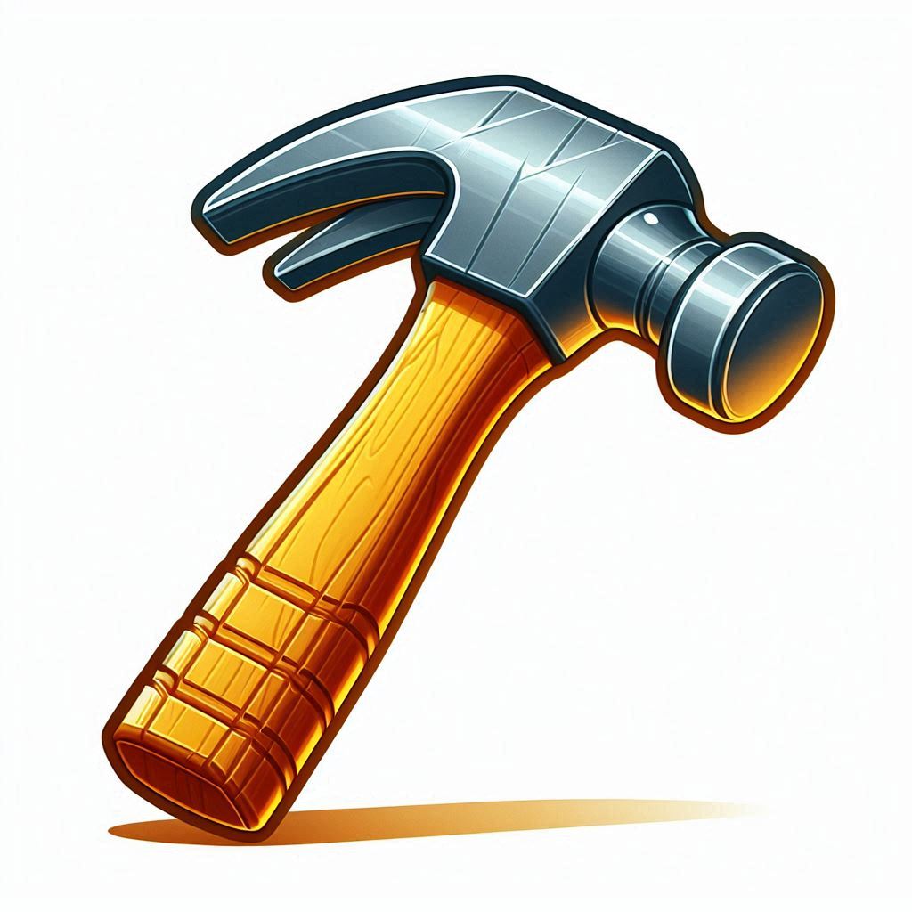 A cartoon illustration of a hammer with a wooden handle and a metal head.
