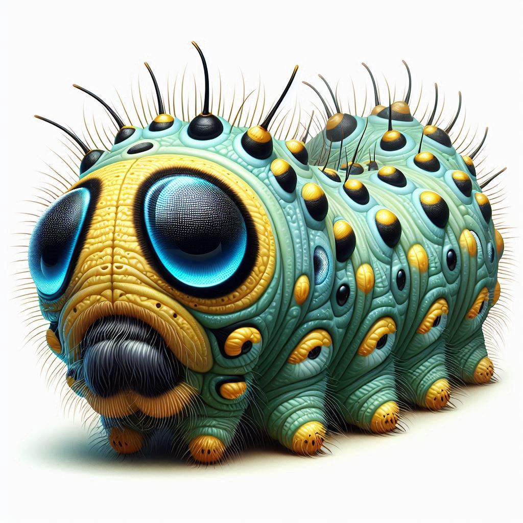 A detailed illustration of a green and yellow caterpillar with large blue eyes.
