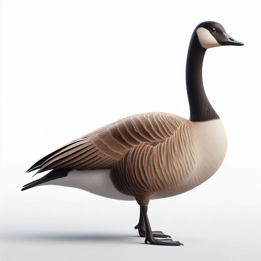 A Canada goose stands on a white background, looking to the right. Its feathers are brown and white.