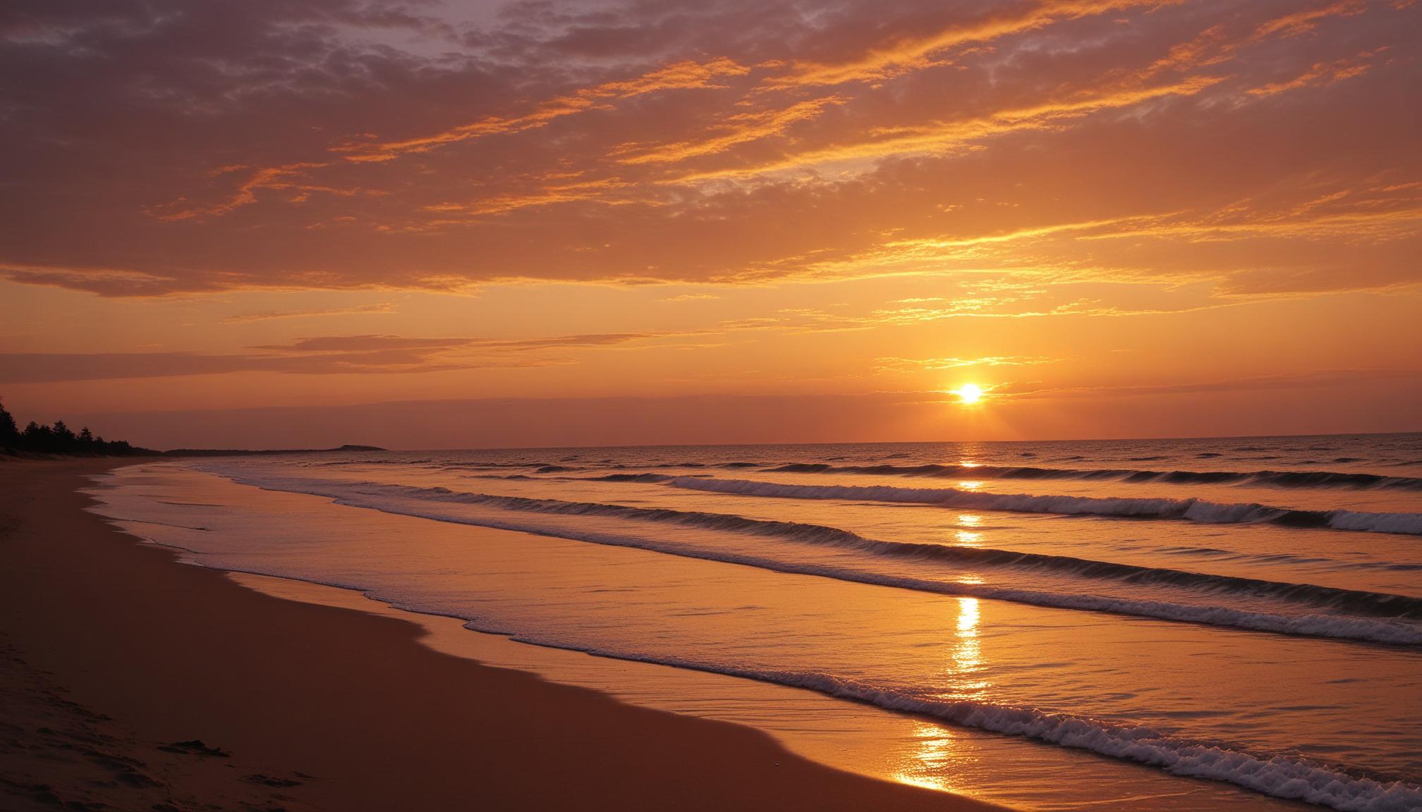 A golden sunset casts its warm light over a sandy beach, with gentle waves lapping at the shore.