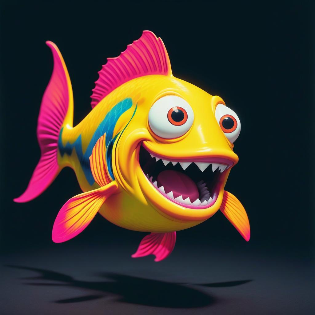A yellow cartoon fish with a big grin, bright pink and blue fins, and large eyes swims against a black background.