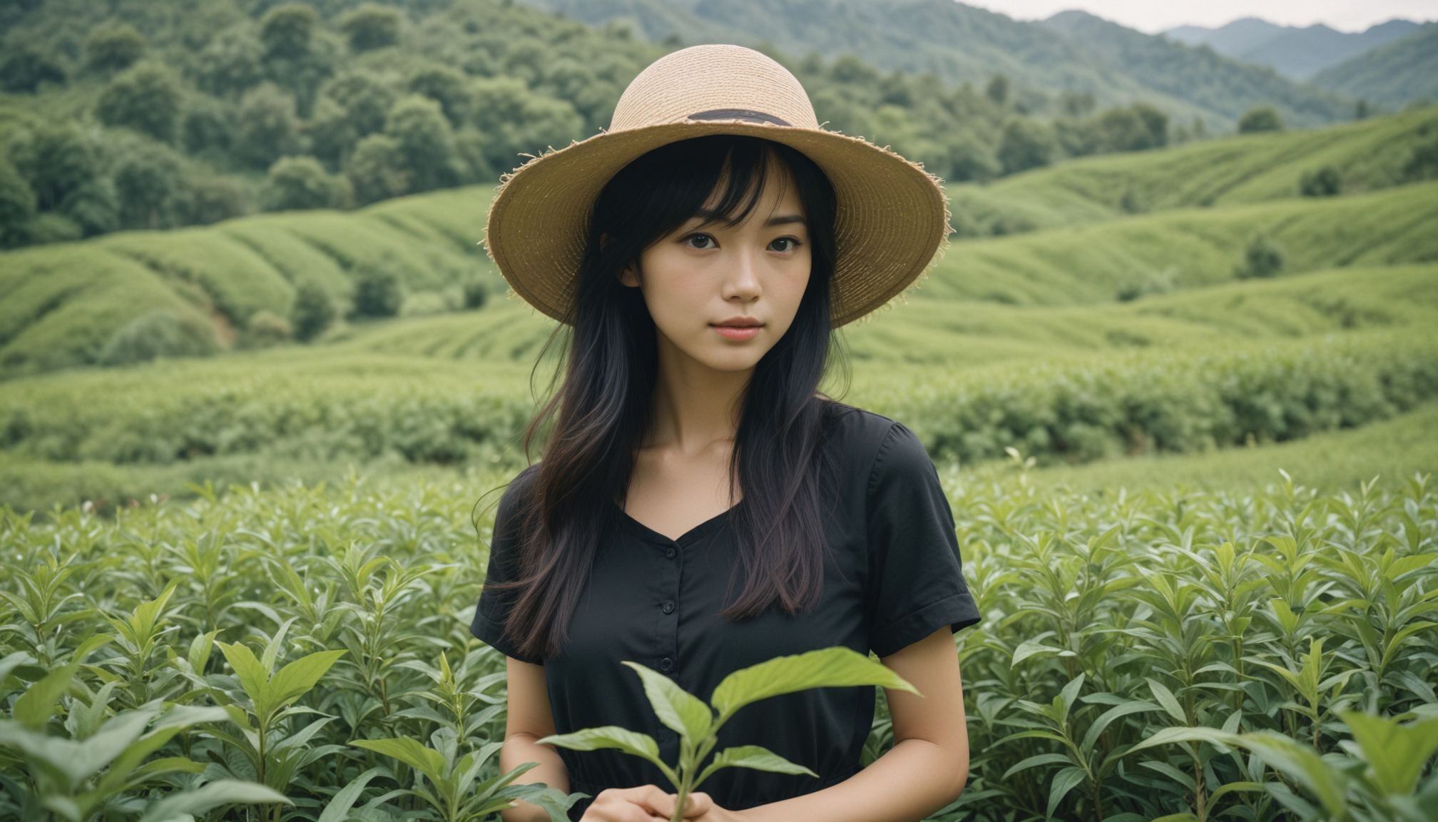 A woman wearing a straw hat stands in a field of green tea plants.