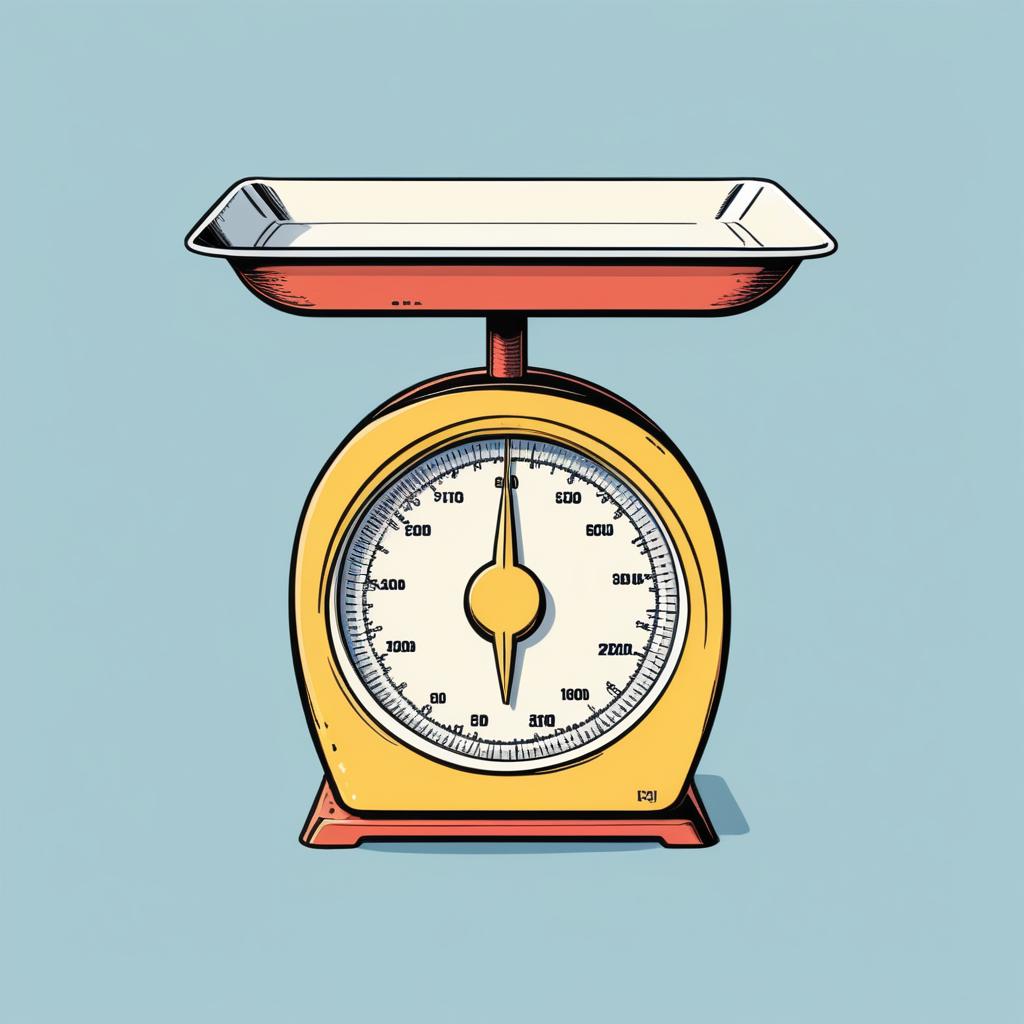 A cartoon illustration of a vintage kitchen scale, set against a light blue background.