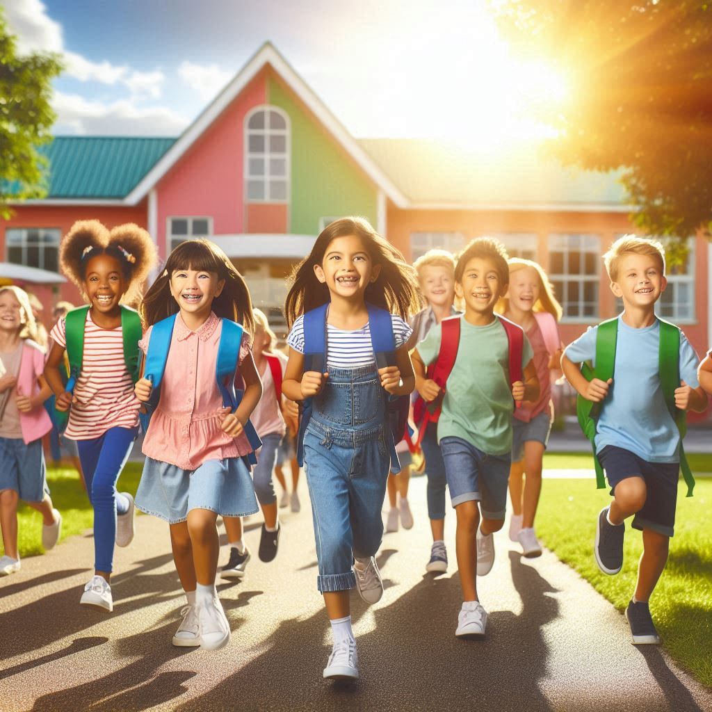 backpack, building, carefree, children, education, elementary, friends, happy, joy, kids, laughing, outdoors, playful, running, school, smile, summer, sunlight, sunset, walkway