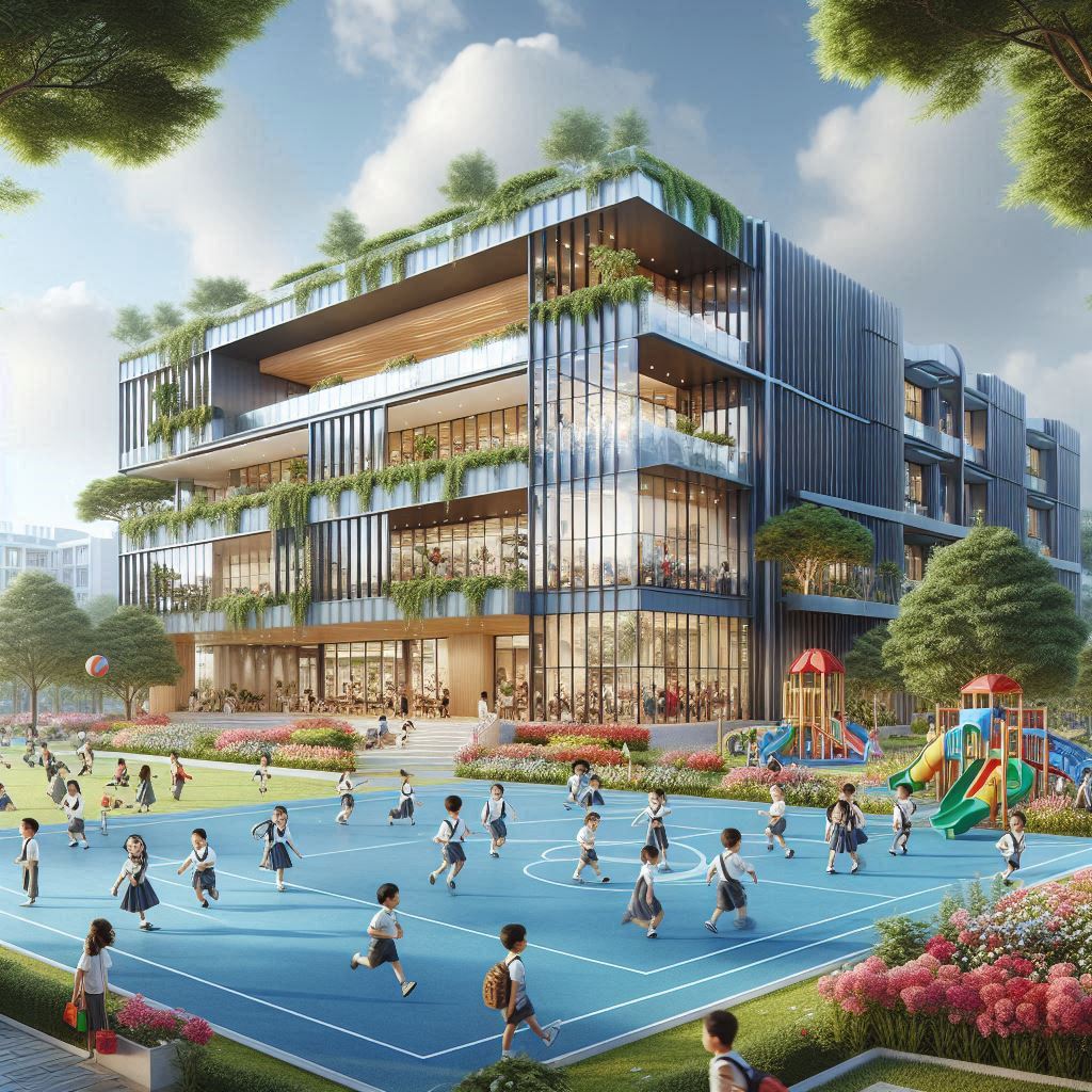 architecture, blue, building, campus, children, court, education, fun, game, green, happy, learning, modern, outdoor, play, playground, roof, school, students, sunny