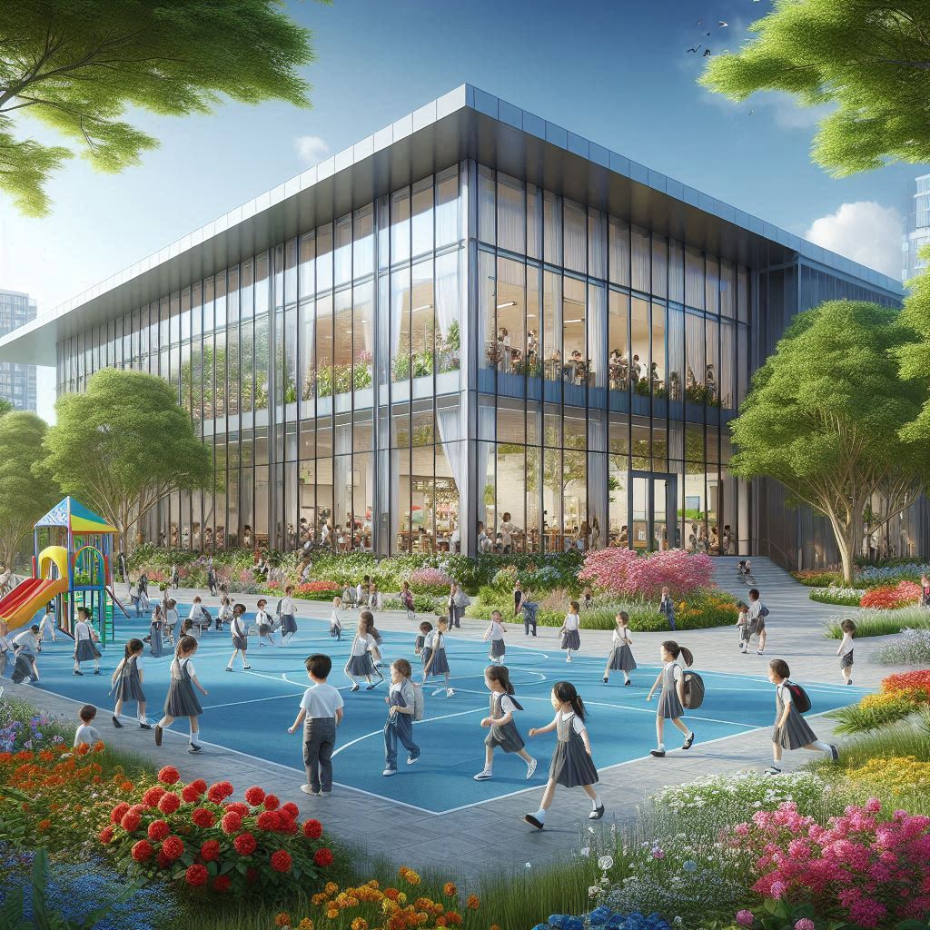 Children play on a blue basketball court in front of a modern school building. They are surrounded by lush greenery and colorful flowers.