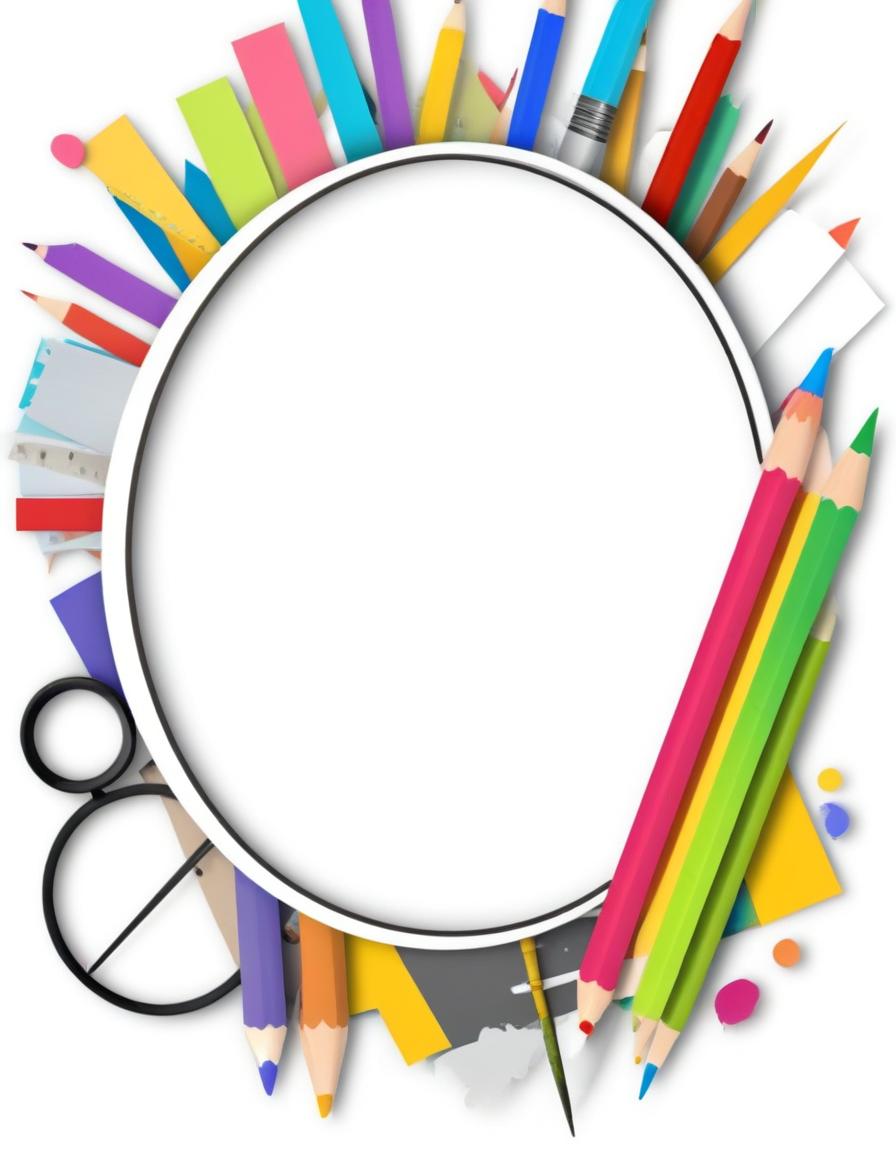 A white circle outlined in black with a variety of colorful school supplies, such as pencils, crayons, and paper, arranged around it.