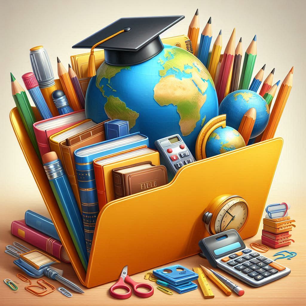 A yellow folder overflowing with school supplies, including books, pencils, a graduation cap, globes, a calculator, and a clock.