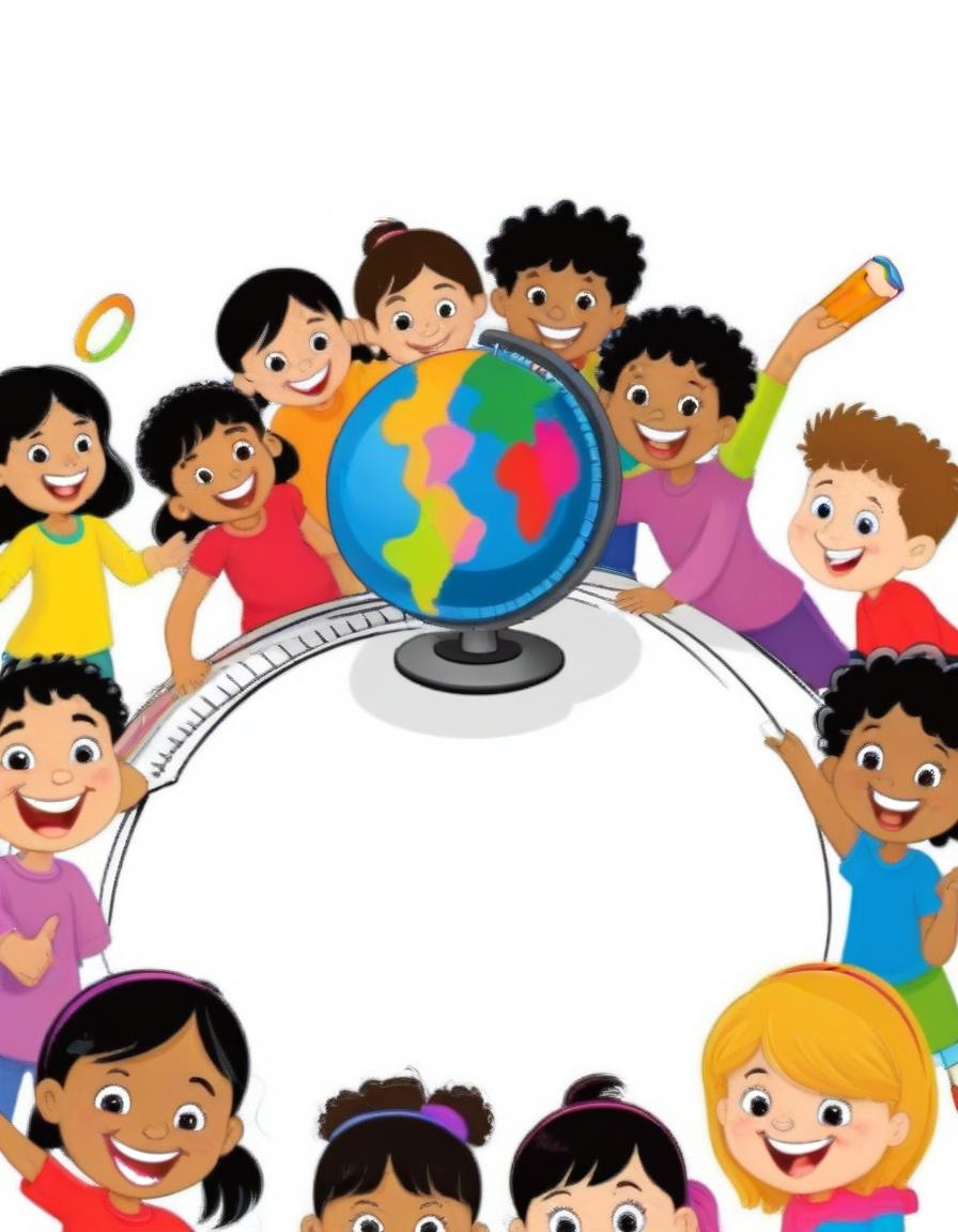Children of different ethnicities gather around a globe, smiling and holding learning materials.