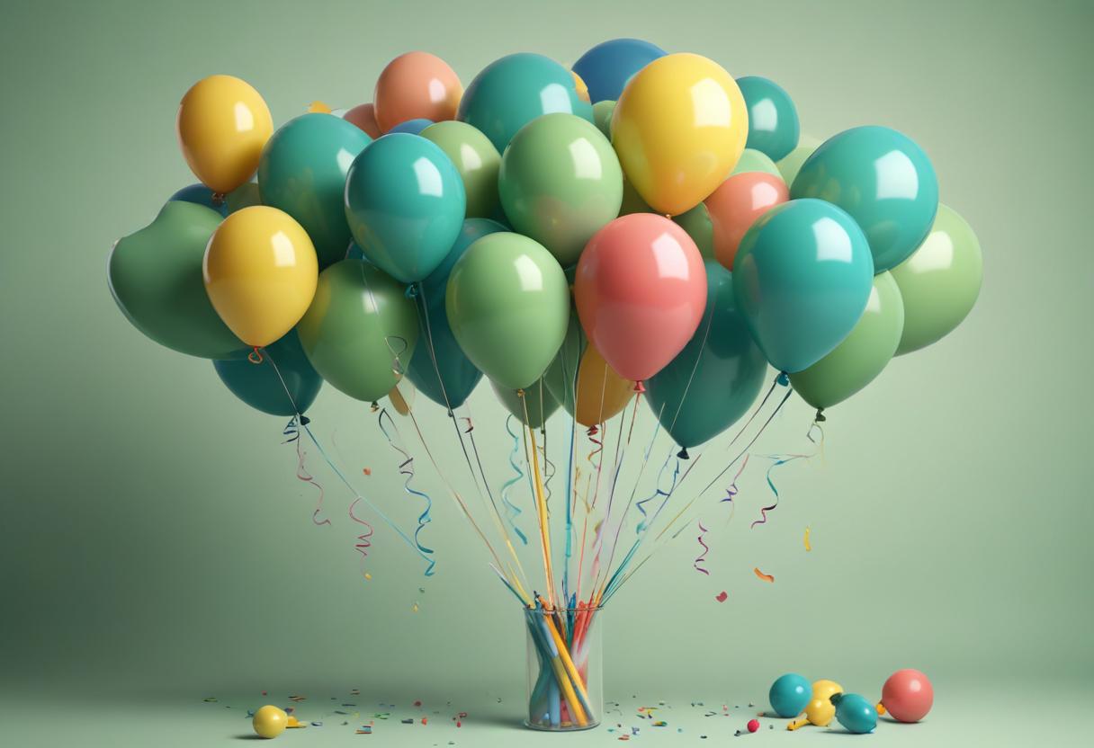 air, balloons, birthday, bright, bunch, celebration, colorful, confetti, decoration, festive, float, green, happy, joy, occasion, party, ribbons, teal, vase, yellow