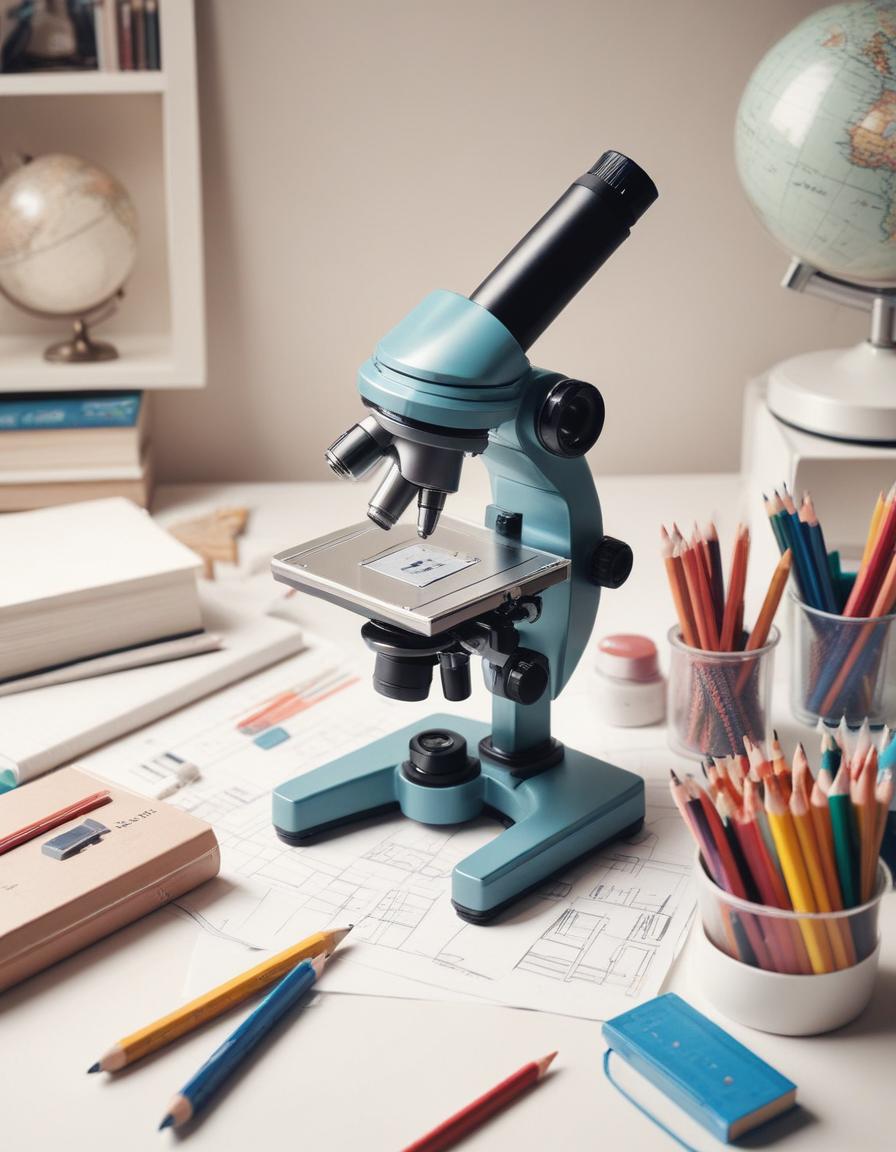 A blue microscope sits on a desk with pencils, notebooks, and papers.