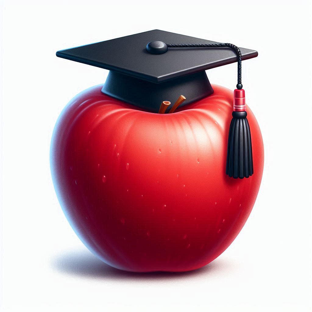 A red apple with a black graduation cap on top, representing education and knowledge.