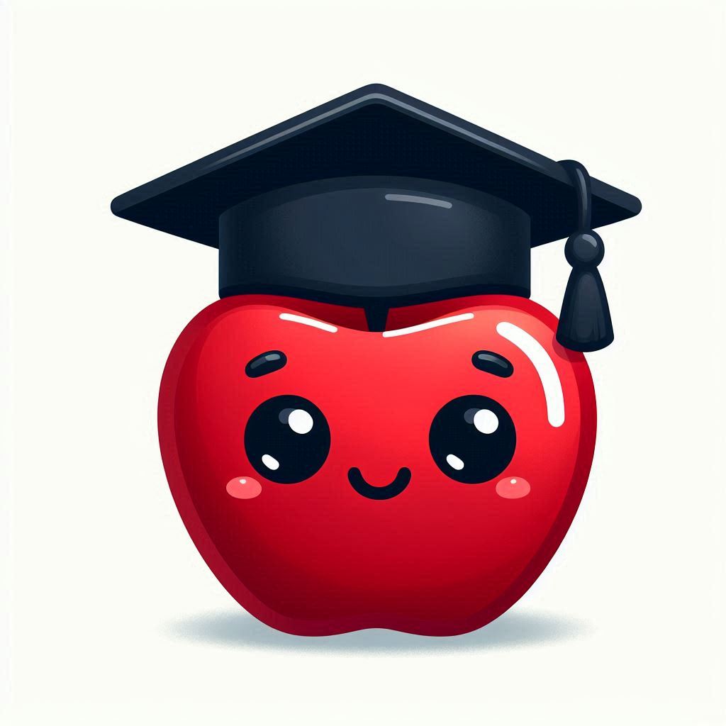 A red apple with a happy face wears a black graduation cap.