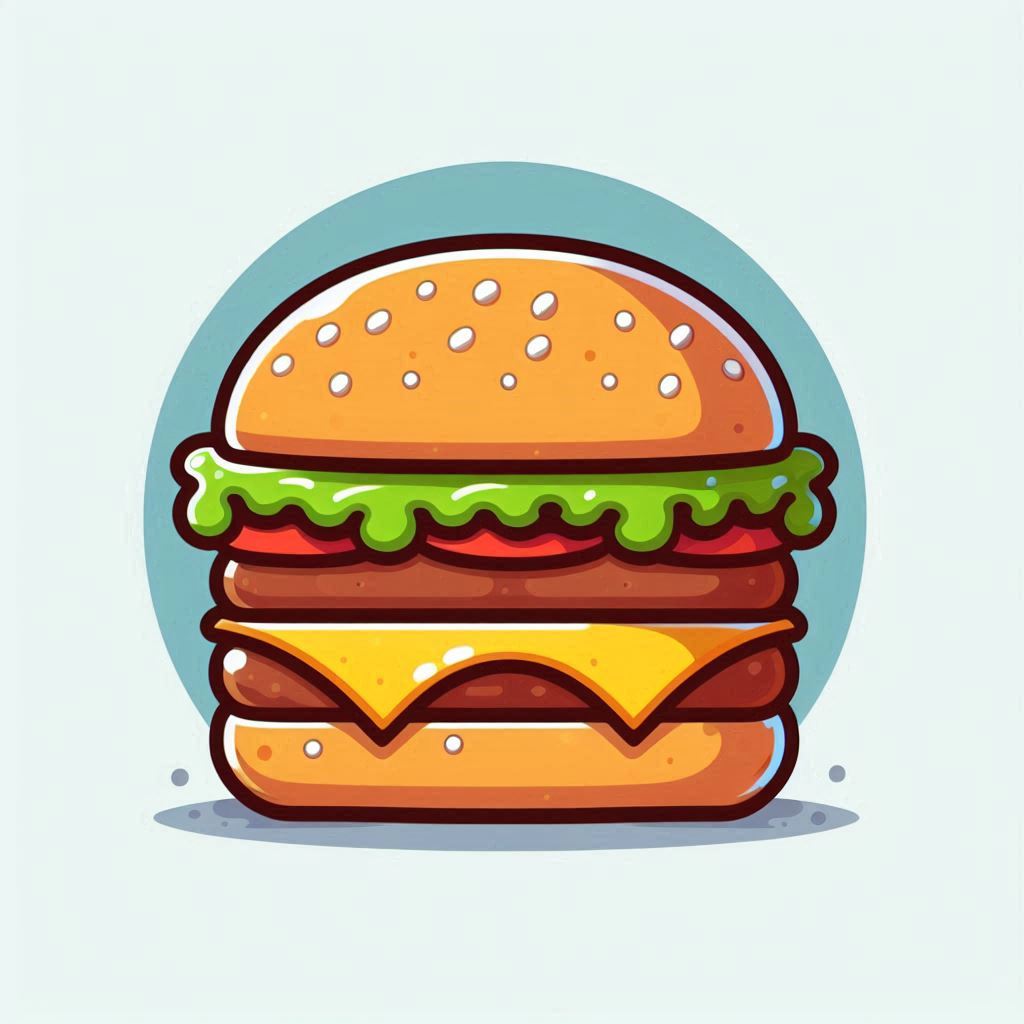 A cartoon illustration of a double cheeseburger with lettuce, tomato, and cheese.