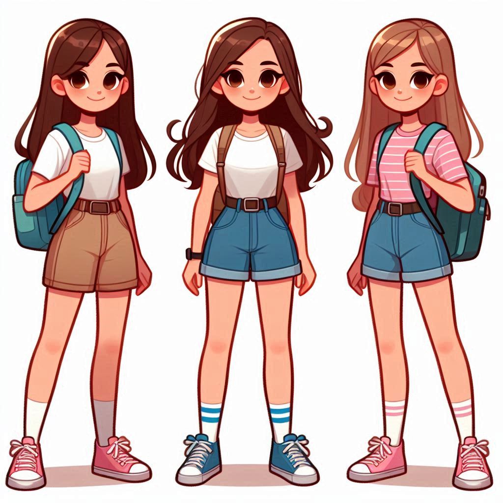 anime, backpack, blue, cartoon, casual, character, denim, fashion, friends, girls, hair, illustration, long, outfit, pink, shirt, shorts, striped, summer, white