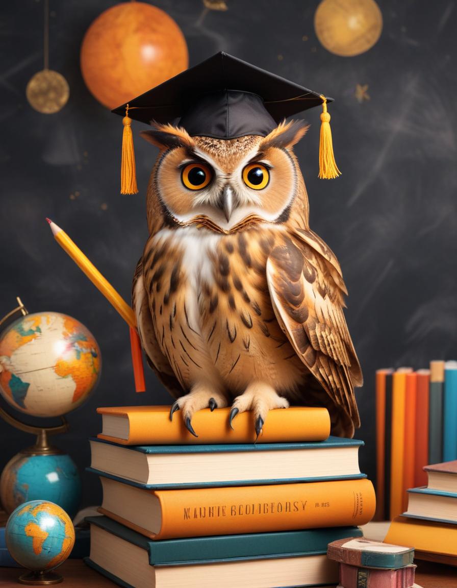 A wise owl wearing a graduation cap sits perched on a stack of books, holding a pencil, and looking intently at the viewer.