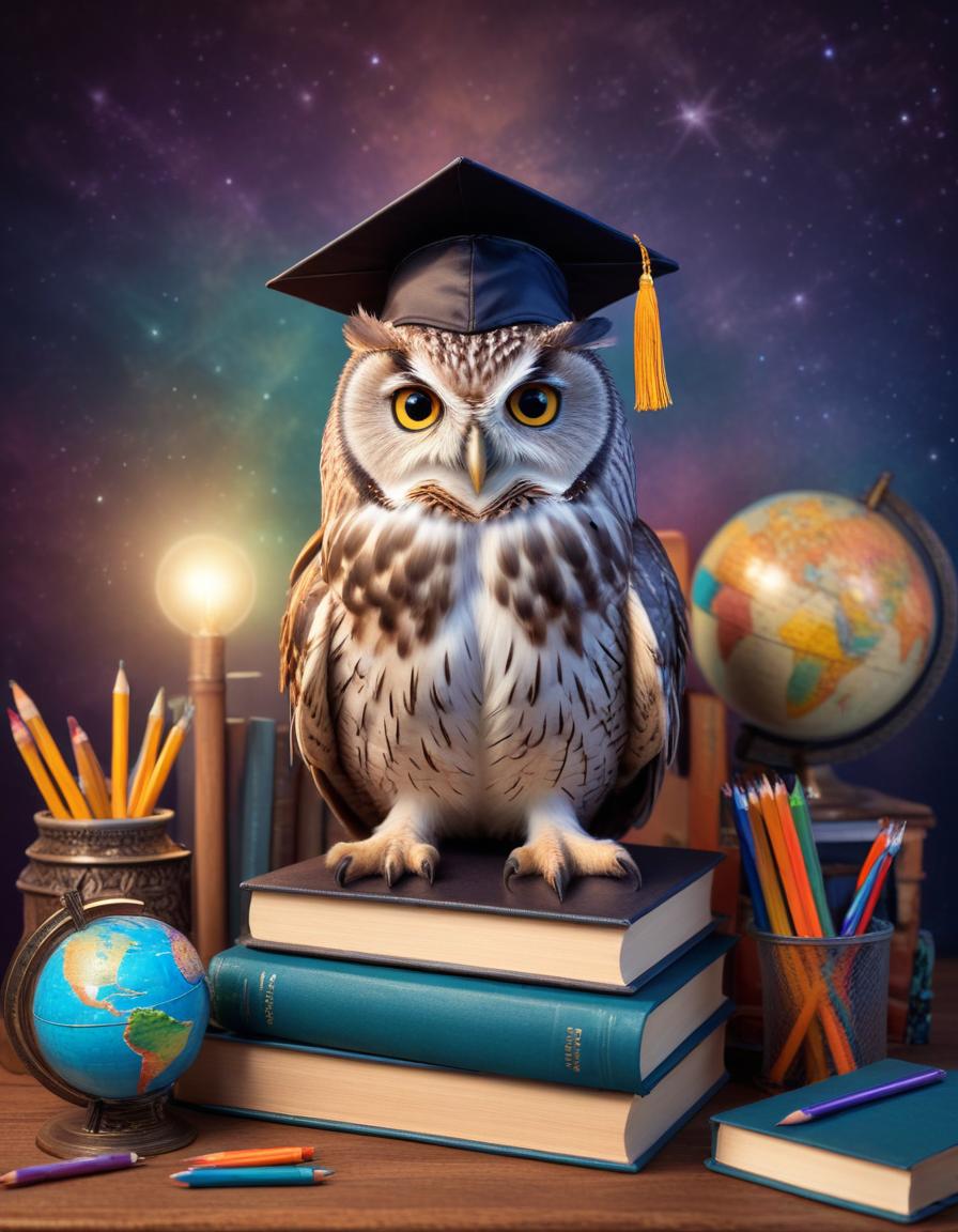 An owl wearing a graduation cap sits on top of a stack of books, surrounded by pencils, a globe, and a lit candle.