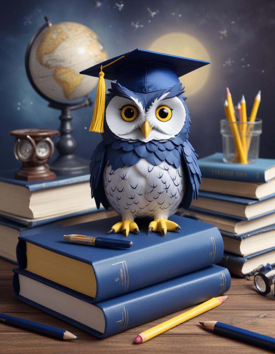 A wise owl wearing a graduation cap sits on a stack of books with a globe and pencils in the background.