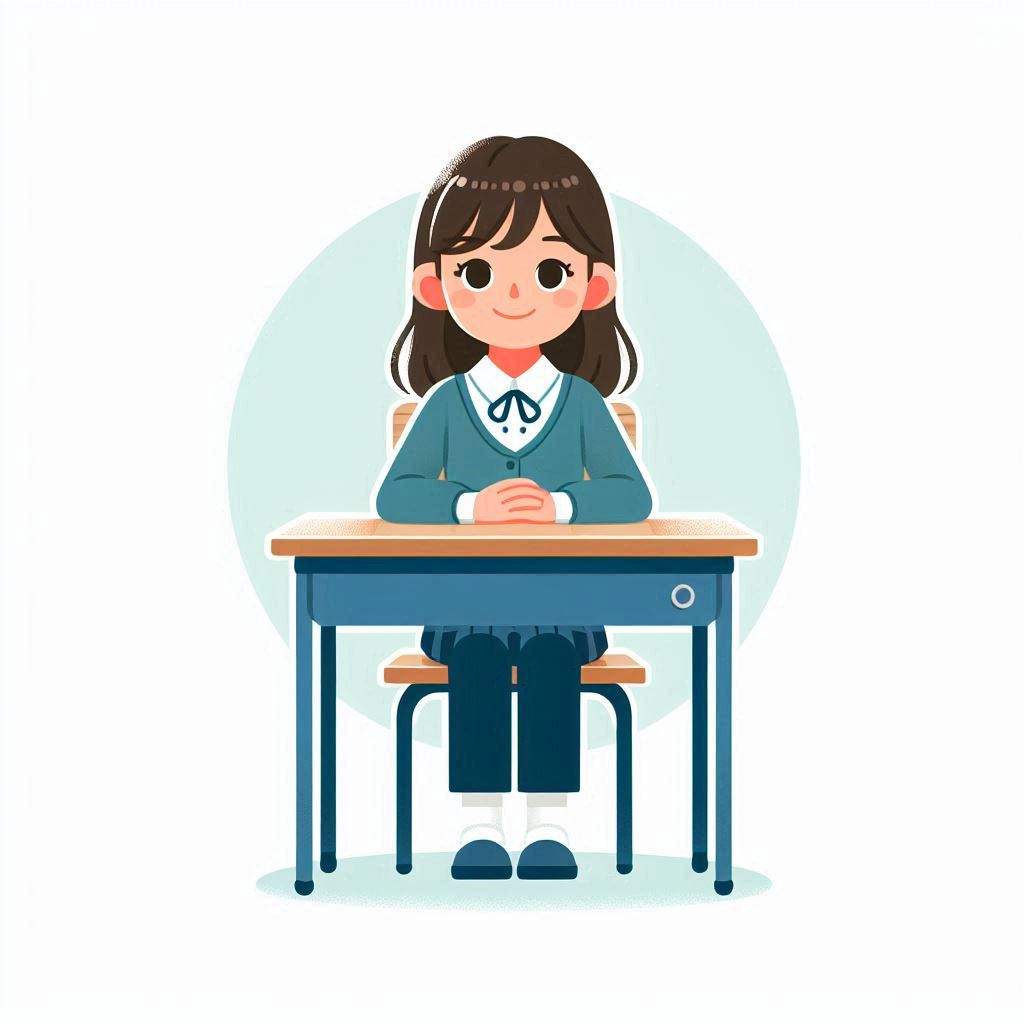 art, blue, cartoon, chair, character, clasped, classroom, desk, digital, education, girl, hands, illustration, learning, school, sitting, student, study, uniform, wooden