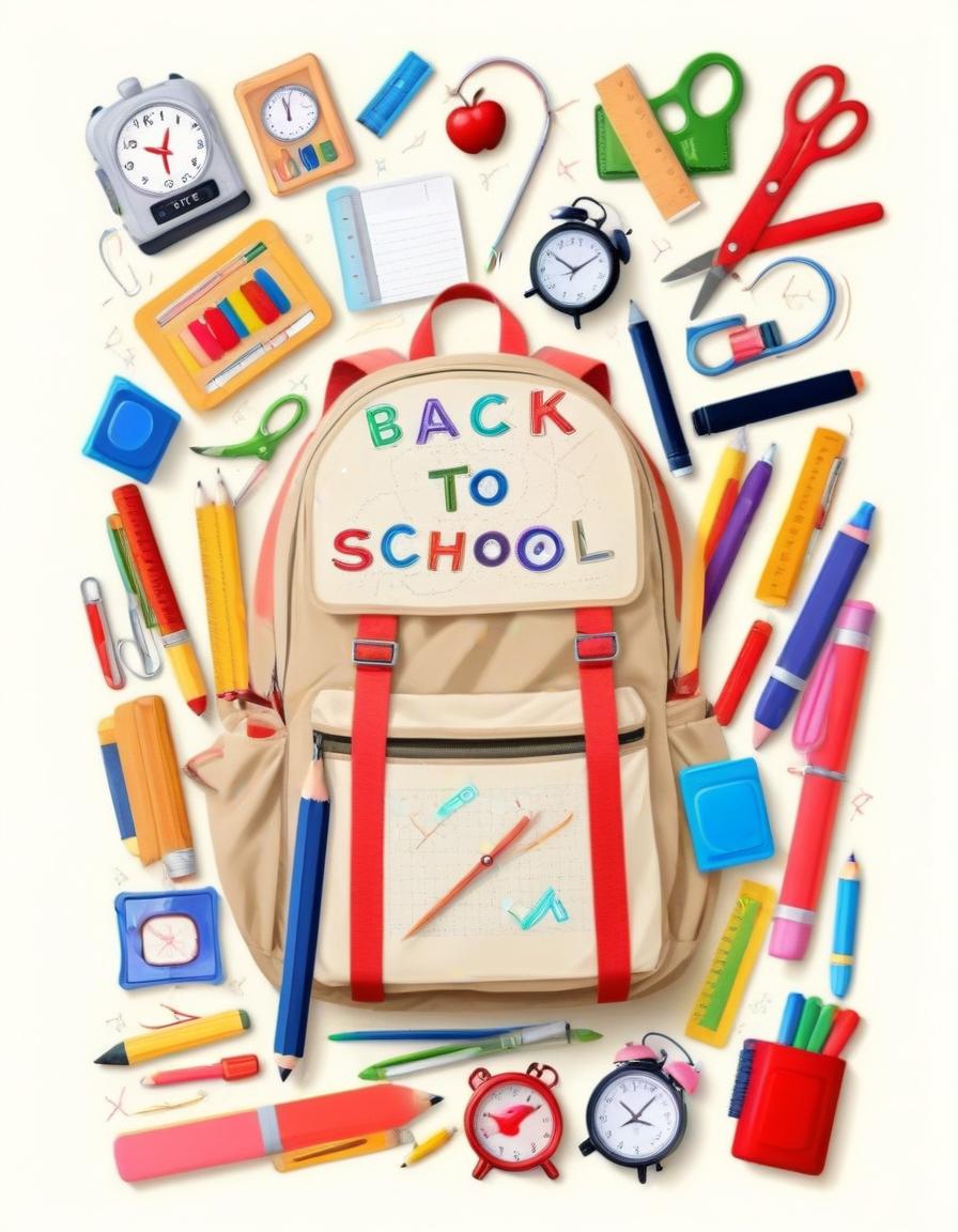 A beige backpack filled with various school supplies, including pens, pencils, and clocks, ready for the new school year.