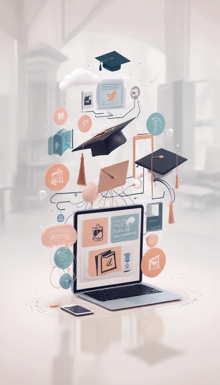 A laptop displays educational icons and graduation caps, symbolizing online learning and achievement.