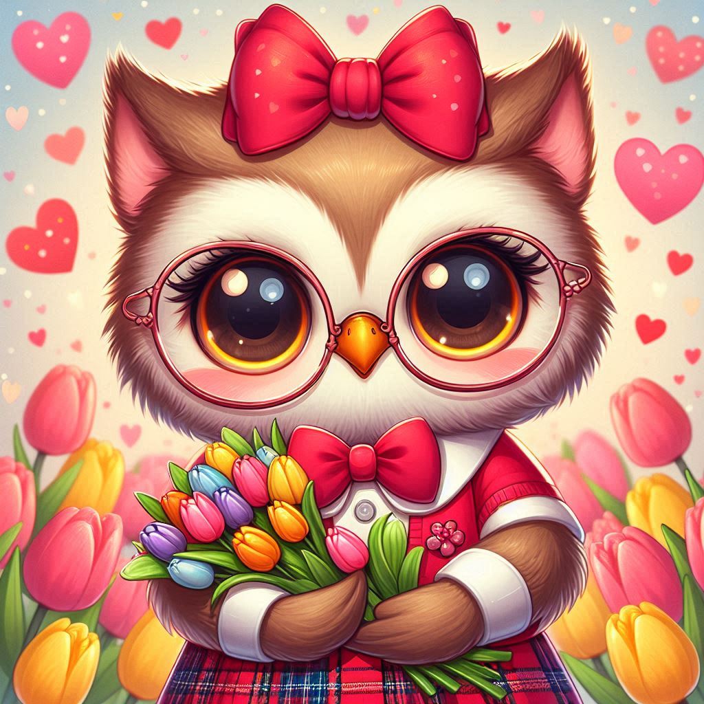 A charming owl character in glasses wears a bow and holds a bouquet, surrounded by colorful tulips and hearts.