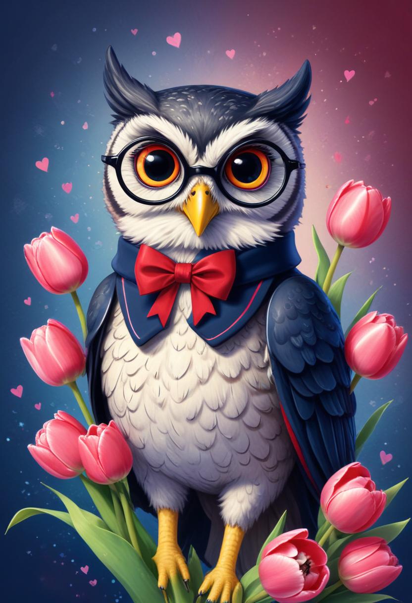 A charming owl in glasses and a bow tie stands among blooming pink tulips.